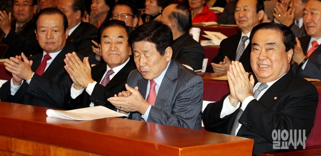 9일 서울 여의도 국회 헌정기념관에서 열린 '개헌추진국민연대 출범식 및 국회의원 초청강연'에서 참석자들이 박수를 치고 있다. 오른쪽부터 새정치민주연합 문희상 비상대책위원장, 유인태 의원, 새누리당 이재오 의원, 최병국 전 의원.
