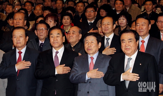 9일 서울 여의도 국회 헌정기념관에서 열린 '개헌추진국민연대 출범식 및 국회의원 초청강연'에서 참석자들이 국기에 대한 경례를 하고 있다. 오른쪽부터 새정치민주연합 문희상 비상대책위원장, 유인태 의원, 새누리당 이재오 의원, 최병국 전 의원.