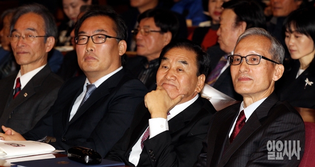 새누리당 이재오 의원(오른쪽에서 두번째)이 9일 서울 여의도 국회 헌정기념관에서 열린 '개헌추진국민연대 출범식 및 국회의원 초청강연'에서 홍보영상물을 시청하고 있다.