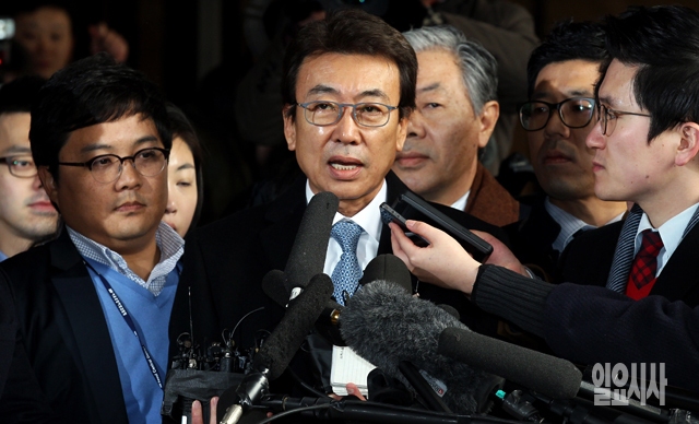 '비선 실세' 의혹의 중심에 서 있는 정윤회씨가 10일 서울 서초동 서울중앙지검으로 조사를 받기 위해 들어서며 취재진의 질문에 답하고 있다.