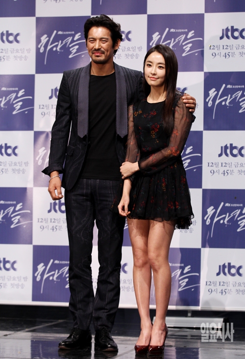 배우 오지호(왼쪽)와 정유미가 10일 서울 중구 호암아트홀에서 열린 JTBC 드라마 <하녀들>(연출 조현탁, 극본 조현경) 제작발표회에서 포토타임을 갖고 있다.