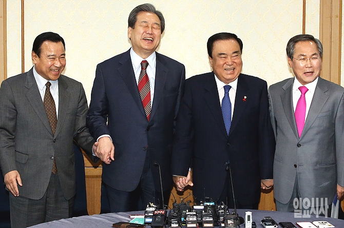 10일, 서울 여의도 국회 귀빈식당에서 새누리당 김무성 대표(사진 왼쪽서 두 번째)·새정치민주연합 문희상 비상대책위원장(사진 오른쪽서 두 번째), 이완구(사진 왼쪽)·우윤근 원내대표 등 지도부가 '여야 2+2회동' 직전, 활짝 웃고 있다.