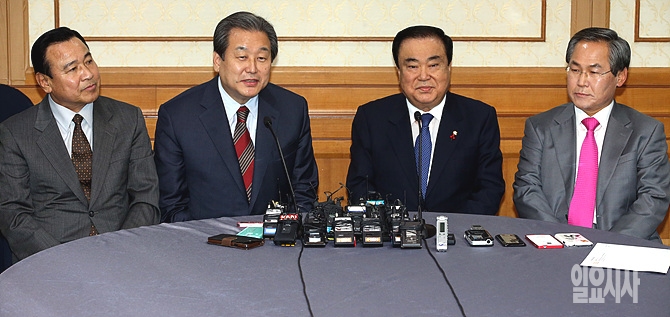 10일, 서울 여의도 국회 귀빈식당에서 새누리당 김무성 대표(사진 왼쪽서 두 번째)·새정치민주연합 문희상 비상대책위원장(사진 오른쪽서 두 번째), 이완구(사진 왼쪽)·우윤근 원내대표 등 지도부가 '여야 2+2회동'을 갖고 있는 가운데, 김 대표가 발언하고 있다.