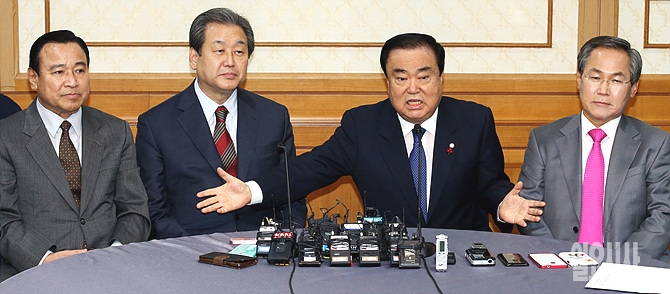 10일, 서울 여의도 국회 귀빈식당에서 새누리당 김무성 대표(사진 왼쪽서 두 번째)·새정치민주연합 문희상 비상대책위원장(사진 오른쪽서 두 번째), 이완구(사진 왼쪽)·우윤근 원내대표 등 지도부가 '여야 2+2회동'을 갖고 있는 가운데, 문 비대위원장이 의견 제안하는 제스처를 취하고 있다.
