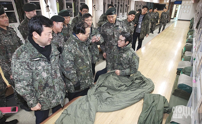 10일, 국회 군 인권개선 및 병영문화혁신 특별위원회 위원장을 맡고 있는 새누리당 정병국 등 의원들이 강원도 철원 3사단 전방대대에서 병영 실태파악을 위해 군부대 생활관을 방문해 침낭을 만져보고 있다. (사진공동취재단)