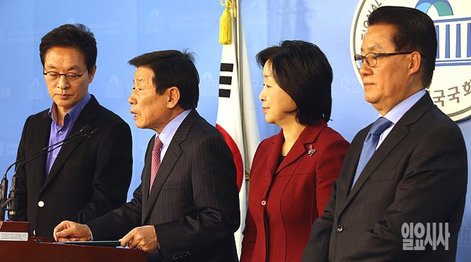 10일, 서울 여의도 국회 정론관에서 새누리당 정두언, 새정치민주연합 유인태, 정의당 심상정 원내대표, 새정치민주연합 박지원 의원(사진 오른쪽부터)이 사형제 폐지를 주장하는 기자회견을 갖고 있다.