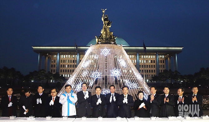 10일, 서울 여의도 국회 중앙분수대에 처음으로 성탄 트리가 설치돼 밝게 빛나고 있는 가운데 국회 새누리당 홍문종 등 조찬기도회 소속 의원들과 박형준 국회 사무총장 등 사무처 관계자들이 점등식 직후 박수를 치며 자축하고 있다.
