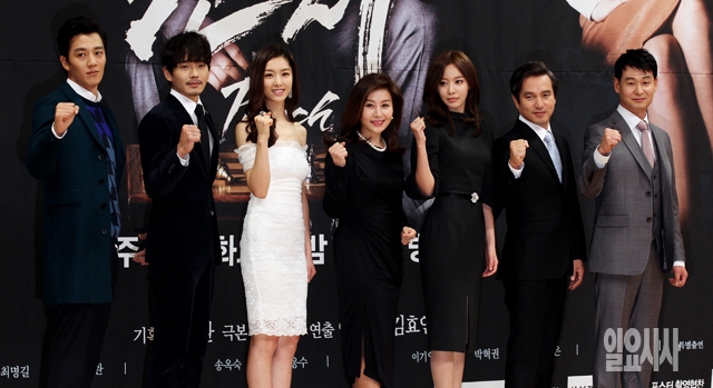 11일 서울 양천구 SBS 목동사옥에서 열린 월화드라마 <펀치>(연출 이명우, 극본 박경수) 제작발표회에서 출연배우들이 포토타임을 갖고 있다. 왼쪽부터 배우 김래원, 온주완, 서지혜, 최명길, 김아중, 조재현, 박혁권.