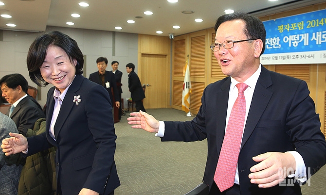 11일, 서울 여의도 국회 의원회관에서 열린 평자포럼 2014년 연말 대토론회 '한국 사회 대전환, 어떻게 새로운 정치주체를 형성할 것인가' 직전, 김부겸 새정치민주연합 전 의원(사진 오른쪽)과 심상정 정의당 원내대표가 이야기를 나누며 웃고 있다.