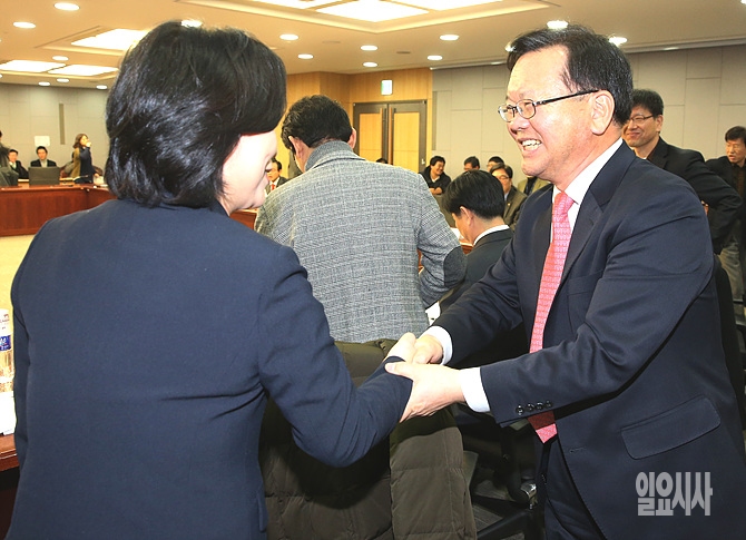 11일, 서울 여의도 국회 의원회관에서 평자포럼 2014년 연말 대토론회 '한국 사회 대전환, 어떻게 새로운 정치주체를 형성할 것인가'가 열린 가운데, 토론회 직전 김부겸 새정치민주연합 전 의원(사진 오른쪽)과 심상정 정의당 원내대표가 반가움의 악수를 나누고 있다.