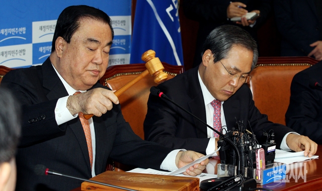새정치민주연합 문희상 비상대책위원장이 12일 서울 여의도 국회에서 열린 확대간부회의에서 회의 시작을 알리는 의사봉을 두드리고 있다.