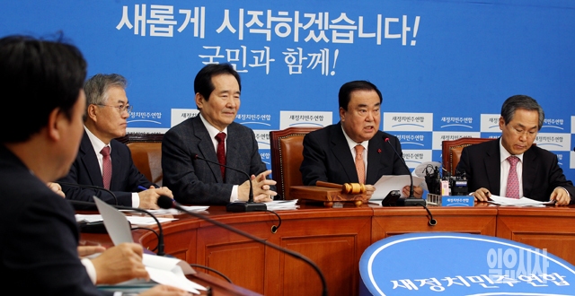 문희상 새정치민주연합 비상대책위원장(오른쪽에서 두번째) 12일 서울 여의도 국회에서 열린 확대간부회의에서 모두발언을 하고 있다.