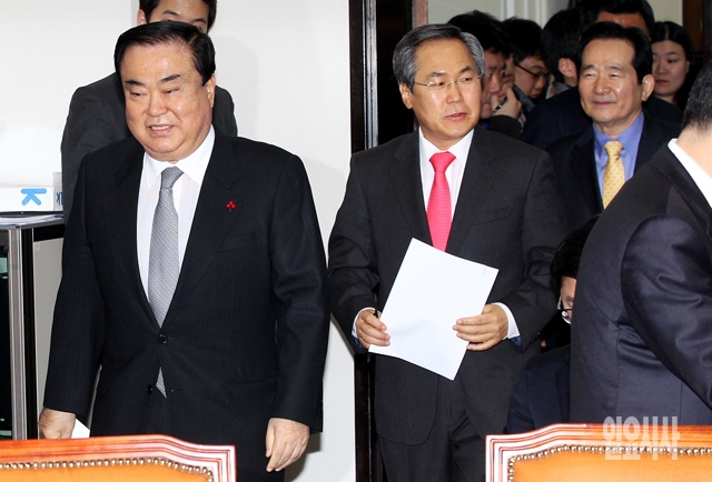 새정치민주연합 문희상 비상대책위원장(왼쪽부터), 우윤근 원내대표, 정세균 비대위원이 15일 서울 여의도 국회에서 열린 비상대책위원회의에 참석하고 있다.