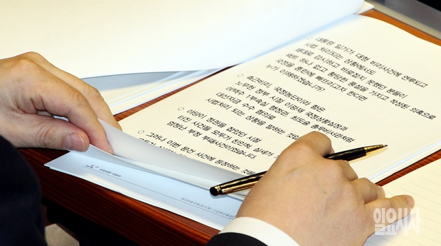 15일 서울 여의도 국회에서 열린 본회의에 참석한 한 의원이 현안 질문 준비를 하고 있다.
