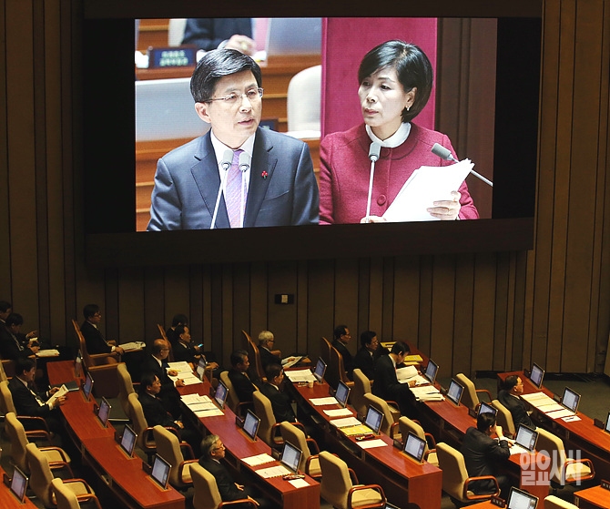 16일, 서울 여의도 국회 본회의장에서 열린 긴급현안질의에서 새정치민주연합 최민희 의원과 황교안 법무부장관이 질의응답을 하고 있다.