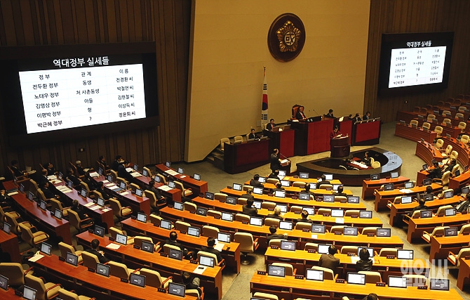 16일, 서울 여의도 국회 본회의장에서 열린 긴급현안질의 도중 미리 준비한 역대 정권 실세들에 대한 자료가 전광판에 표시되고 있다.