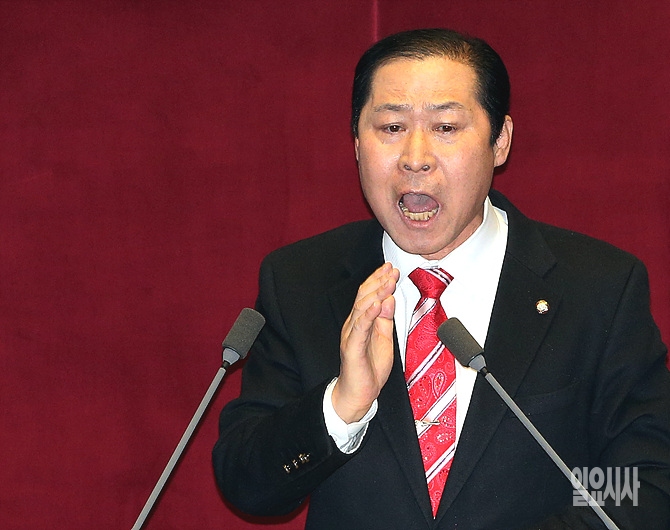 16일, 서울 여의도 국회 본회의장에서 열린 긴급현안질의에서 새누리당 이노근 의원이 "정치인들은 버릇을 고쳐야 한다"며 새정치민주연합 최민희 의원 등 야당 의원들에 대해 비난하고 있다.