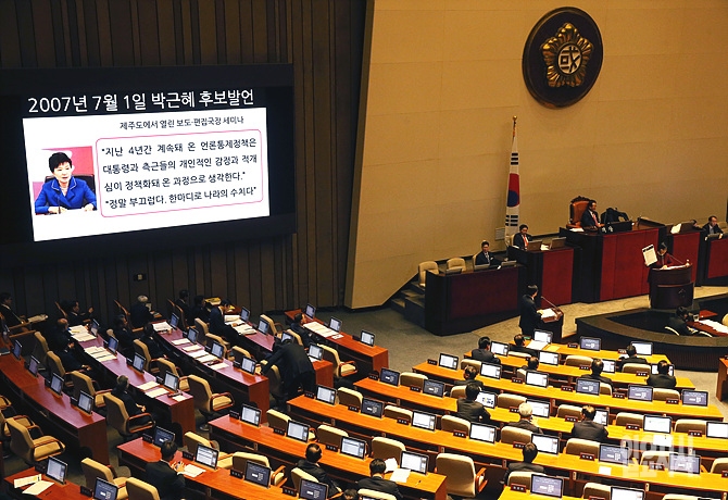 16일, 서울 여의도 국회 본회의장에서 열린 긴급현안질의에서 한 야당 의원이 지난 2007년 박근혜 당시 대선 후보의 발언을 자료로 제시하고 있다.
