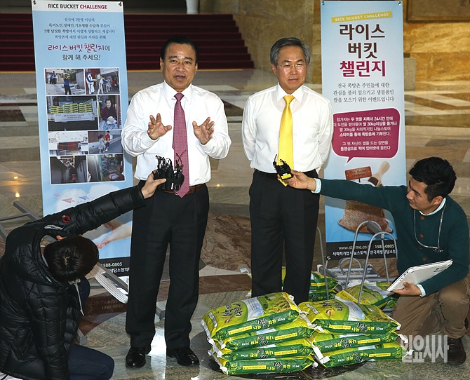 16일, 서울 여의도 국회 본회의장 앞 로텐더홀에서 '라이스버킷첼린지'가 열린 가운데, 새누리당 이완구(사진 왼쪽)-새정치민주연합 우윤근 원내대표가 행사에 참석해 발언하고 있다.