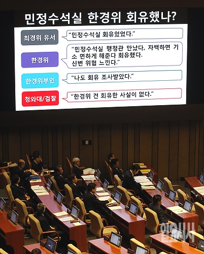 16일, 서울 여의도 국회 본회의장에서 열린 긴급현안질의에서 한 새정치민주연합 의원이 민정수석실 관계자 회유와 관련해 준비해온 자료를 공개하고 있다.