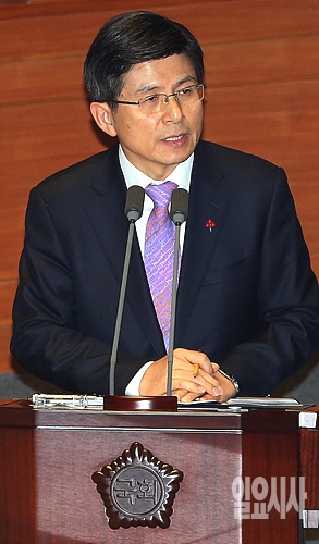 16일, 서울 여의도 국회 본회의장에서 열린 긴급현안질의에서 황교안 법무부장관이 새정치민주연합 최민희 의원의 질문에 답변하고 있다.