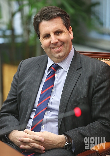 16일, 서울 여의도 국회 새누리당 당 대표실에서 마크 리버트 미국 대사가 김무성 대표의 예방을 받은 자리에서 웃음 짓고 있다.