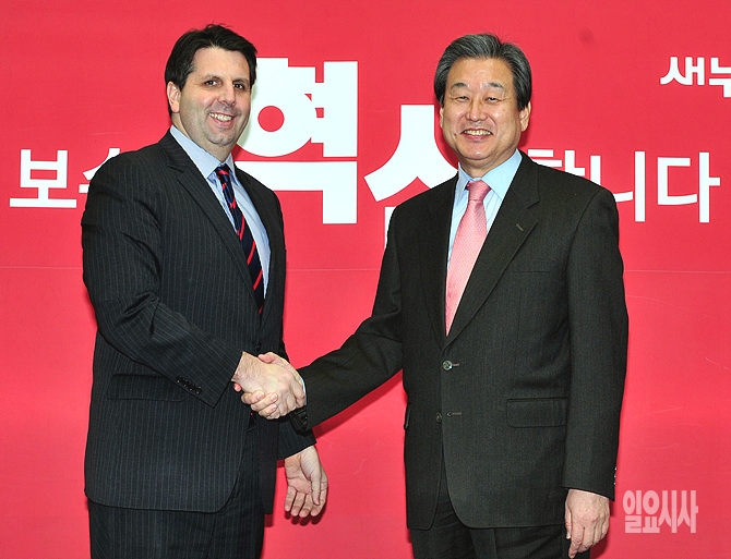 16일, 서울 여의도 국회 새누리당 당 대표실에서 마크 리버트 미국 대사가 김무성 대표의 예방을 받고 서로 악수를 나누고 있다.