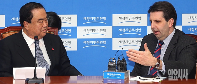16일, 서울 여의도 국회 새정치민주연합 당 대표실에서 마크 리버트 미국 대사가 문희상 비상대책위원장의 예방을 받은 자리에서 대화 삼매경에 빠져 있다.