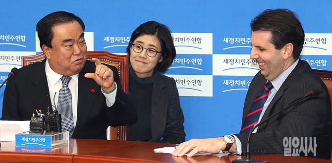 16일, 서울 여의도 국회 새정치민주연합 당 대표실에서 마크 리버트 미국 대사가 문희상 비상대책위원장의 예방을 받은 자리에서 화기애애한 분위기로 이야기를 나누고 있다.