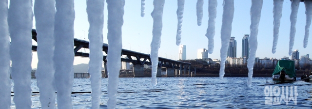전국 곳곳에 한파특보가 내려진 17일 서울 뚝섬유원지 한강변에 묶인 밧줄에 고드름이 맺혀있다.