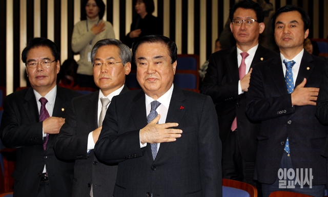 새정치민주연합 문희상 비상대책위원장과 우윤근 원내대표를 비롯한 참석의원들이 17일 서울 여의도 국회에서 열린 비선실세 국정농단·청와대 외압규탄 비상 의원총회에서 국기에 대한 경례를 하고 있다.