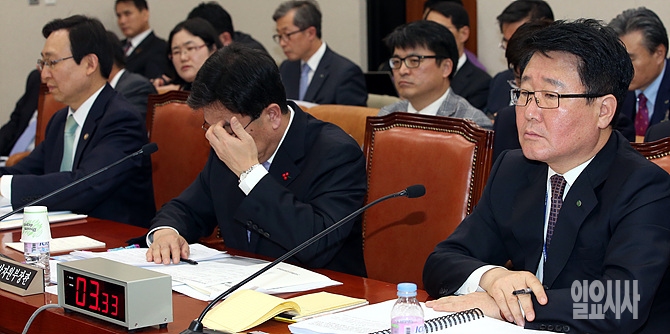 30일, 서울 여의도 국회에서 열린 산업통상자원부 전체회의에서 윤상직 산자부장관(사진 왼쪽)과 조석 한국수자력원자력 사장이 최근 '원전 보안'과 관련해 출석해 있다.
