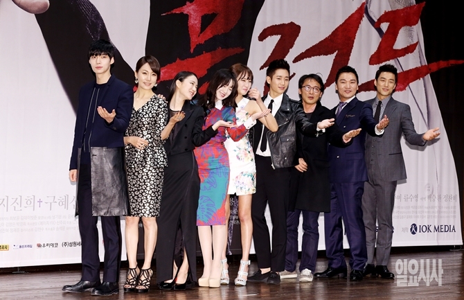 11일 오후 서초구 반포동 서울성모병원 성의회관에서 열린 KBS드라마 <블러드>(연출 기민수, 이재훈/극본 박재범) 제작보고회에서 출연진들이 포즈를 취하고 있다. 왼쪽부터 안재현, 진경, 손수현, 구혜선, 정혜성, 정해인, 기민수PD, 조재윤, 지진희.