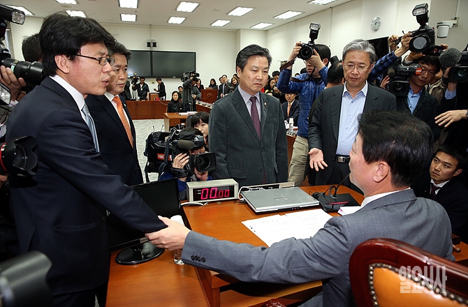 12일, 야당 의원들이 불참한 가운데 서울 여의도 국회에서 열린 이완구 국무총리 후보자에 대한 인사청문 보고서가 채택되자, 새정치민주연합 진성준 의원이 한선교 특위위원장에게 강력히 항의하고 있다.
