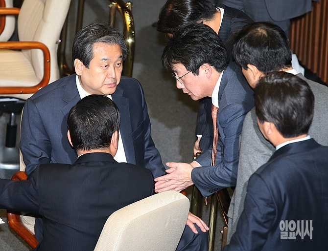 12일, 서울 여의도 국회 본회의장에서 새누리당 김무성 대표와 유승민 원내대표 등이 심각한 표정으로 이야기를 나누고 있다.