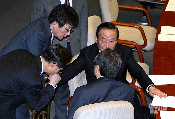 12일, 서울 여의도 국회 본회의장에서 새누리당 김무성 대표와 유승민 원내대표, 서청원 최고위원 등이 심각한 표정으로 이야기를 나누고 있다.