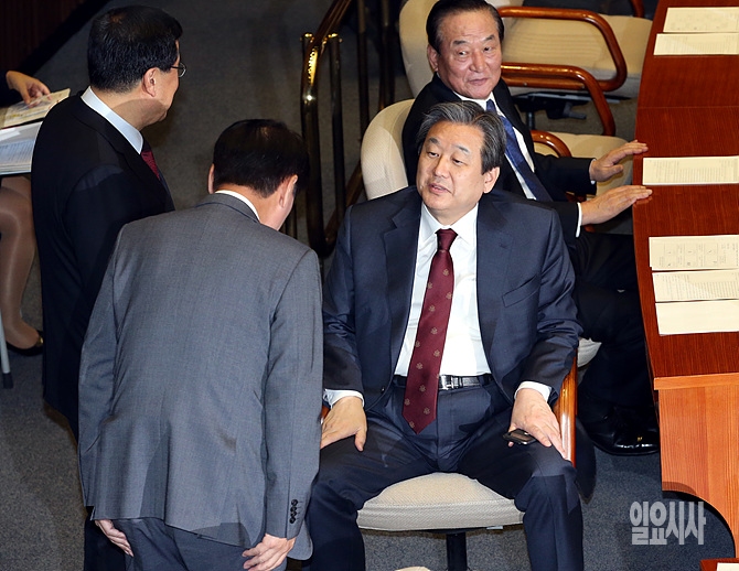 12일, 서울 여의도 국회 본회의장에서 새누리당 한선교 의원(이완구 국무총리 후보자 인사청문특위위원장)이 김무성 대표에게 인사를 하고 있다.