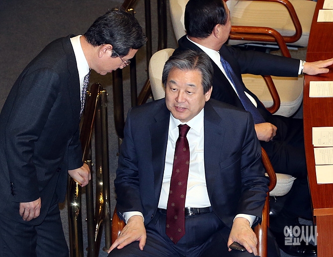 12일, 서울 여의도 국회 본회의장에서 새누리당 김무성 대표가 김학용 비서실장에게 보고 받고 있다.