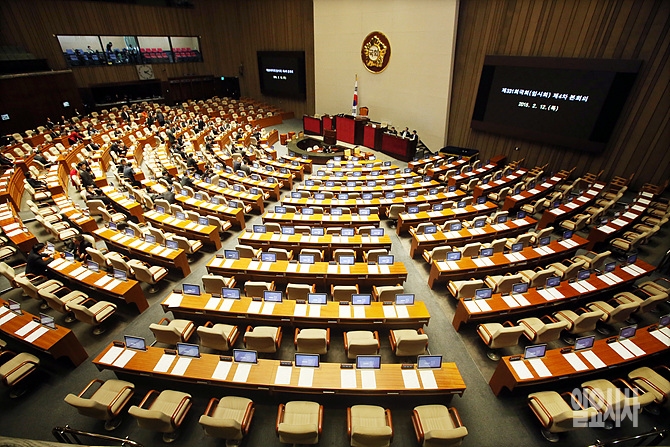 12일, 서울 여의도 국회 본회의장에서 이완구 국무총리 후보자에 대한 인준 표결안 등을 위한 본회의가 열렸지만, 새정치민주연합 등 야당 의원들이 불참해 자리가 텅텅 비어 있다.
