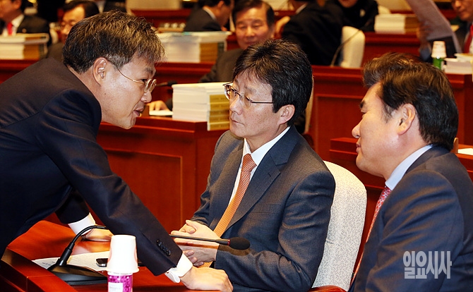 12일, 서울 여의도 국회에서 새누리당 유승민 원내대표가 의원총회 도중 정문헌 이완구 국무총리 후보자 인사청문특위 여당 간사와 심각한 표정으로 이야기를 나누고 있다.