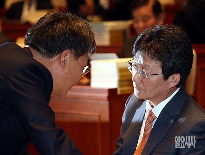 12일, 서울 여의도 국회에서 새누리당 유승민 원내대표가 의원총회 도중 정문헌 이완구 국무총리 후보자 인사청문특위 여당 간사와 심각한 표정으로 이야기를 나누고 있다.