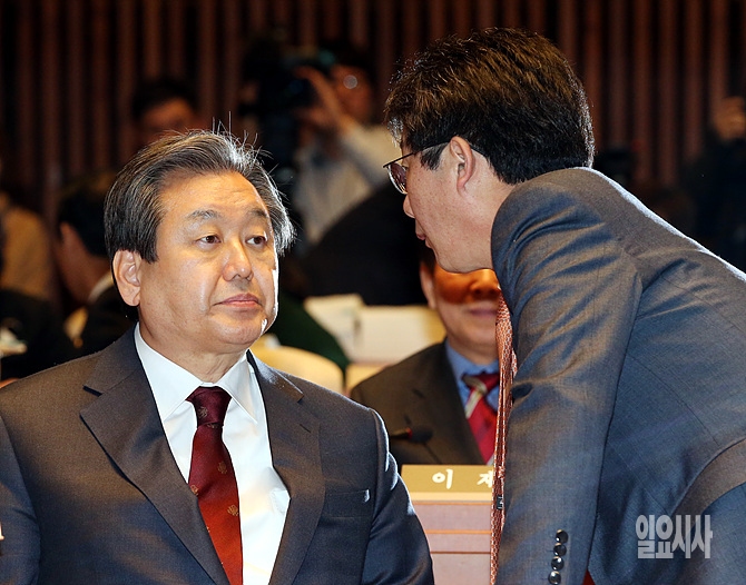 12일, 서울 여의도 국회에서 새누리당 김무성 대표, 유승민 원내대표가 의원총회 도중 심각한 표정을 짓고 있다.
