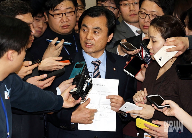 12일, 서울 여의도 국회 정론관 앞에서 새정치민주연합 안규백 원내수석부대표가 이완구 국무총리 후보자 인사청문 보고서 채택 관련 브리핑 직후 취재진의 질문에 답변하고 있다.