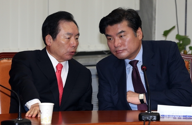 새누리당 이인제 최고위원(왼쪽)과 원유철 정책위의장이 16일 오전 서울 여의도 국회에서 열린 최고위원회의에 참석해 대화를 나누고 있다.