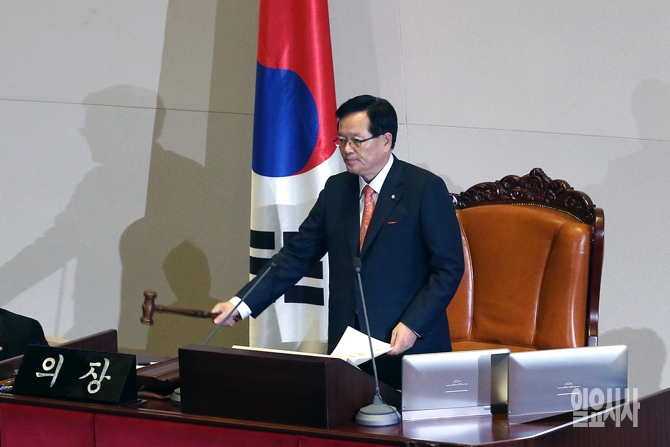 정의화 국회의장이 16일 서울 여의도 국회에서 열린 제331회 국회 (임시회) 제4차 본회의에서 이완구 국무총리 후보자 임명동의안 가결을 발표한 후 의사봉을 두드리고 있다.