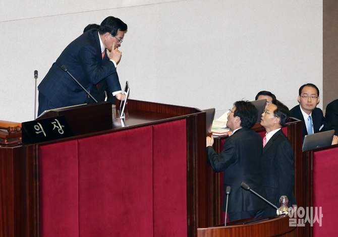 정의화 국회의장과 유승민 새누리당 원내대표가 16일 오후 국회에서 열린 이완구 국무총리 후보자 임명동의안 표결을 위한 본회의에 앞서 대화를 나누고 있다.