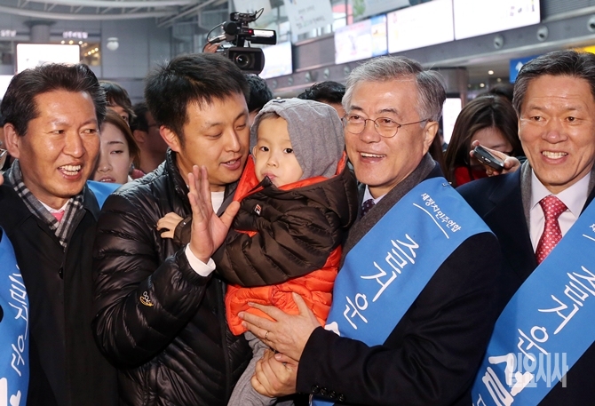 설 연휴를 하루 앞둔 17일 오전 새정치민주연합 문재인 대표를 비롯한 지도부가 서울 용산역을 찾아 귀성객들에게 귀성 인사를 하고 있다.