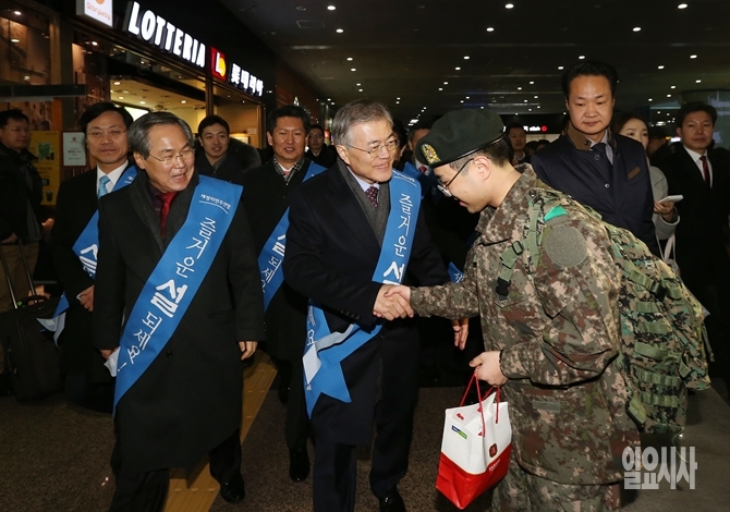설 연휴를 하루 앞둔 17일 오전 새정치민주연합 문재인 대표를 비롯한 지도부가 서울 용산역을 찾아 귀성객들에게 귀성 인사를 하고 있다.