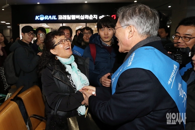 설 연휴를 하루 앞둔 17일 오전 새정치민주연합 문재인 대표를 비롯한 지도부가 서울 용산역을 찾아 귀성객들에게 귀성 인사를 하고 있다.