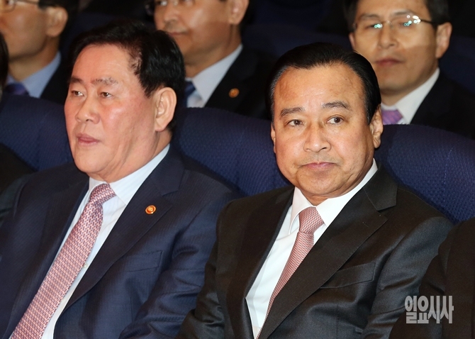 이완구 신임 국무총리(오른쪽)와 최경환 경제부총리가 17일 오후 세종로 정부서울청사에서 열린 '제43대 국무총리 취임식'에서 나란히 앉아 있다.